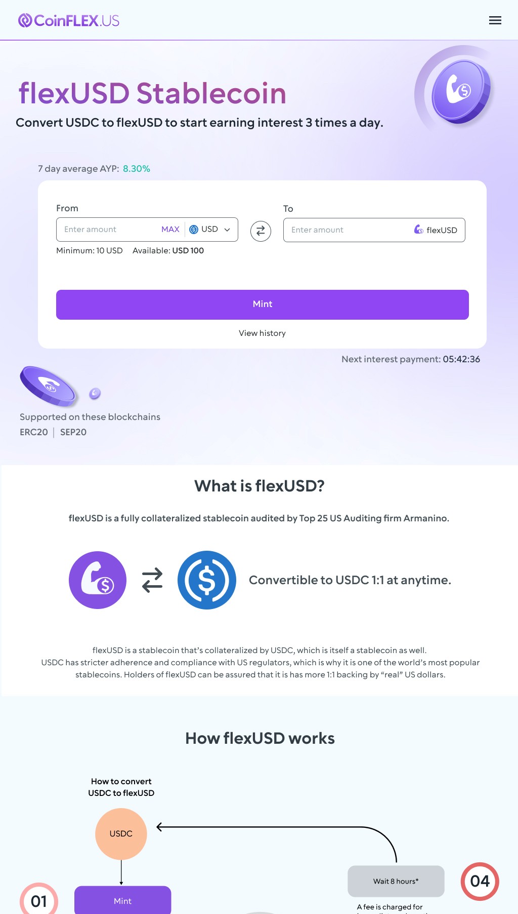 Convert USDC to flexUSD to start earning interest 3 times a day.