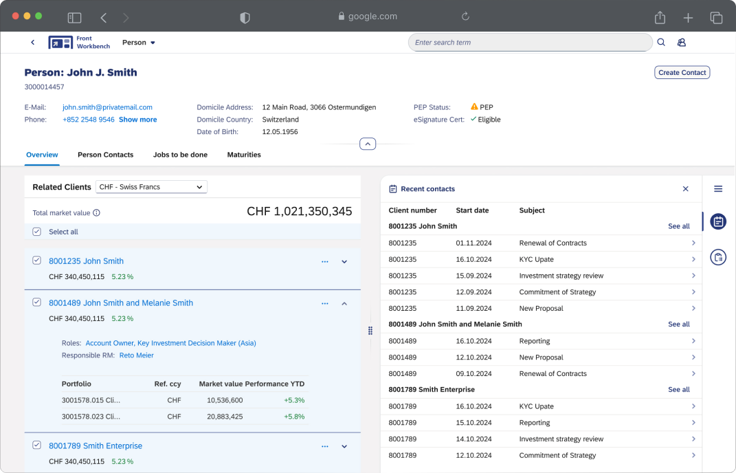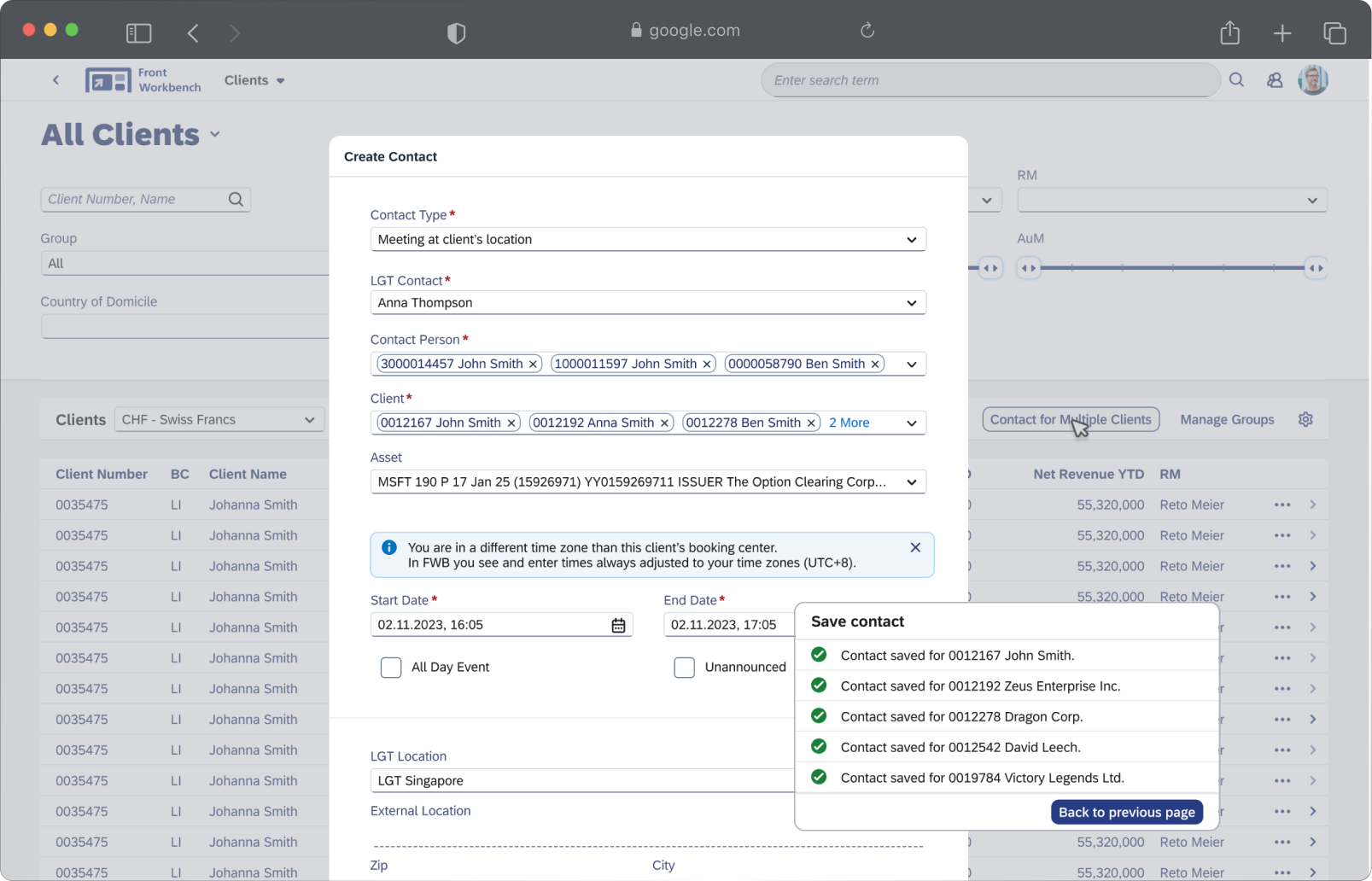 With its headquarters in Liechtenstein, one of the smallest countries in Europe, LGT, is the largest royal family-owned private banking and asset management group in the world. Front Workbench is to be the private bank’s signature internal platform – combining all internal apps from the LGT eco-system into one single app used across Europe and Asia for front office staff.To entice the Private Bank’s 500+ RMs to use yet another new system is the biggest challenge, especially since the old system will not be demised. The difference in needs between the users of the two regions also meant different applications would need to be built to cater for the different requirements.I was one of a team of four designers (1 in APAC, 3 in Europe) who was brought onboard to help create a platform that was to be the go-to-tool for Relationship Managers and their assistants so that they could track and monitor their clients’ accounts and activites.