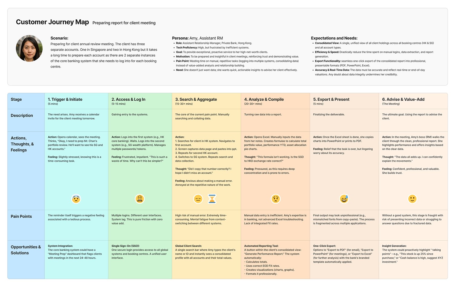 With its headquarters in Liechtenstein, one of the smallest countries in Europe, LGT, is the largest royal family-owned private banking and asset management group in the world. Front Workbench was to be the private bank’s signature internal platform – combining all internal apps from the LGT eco-system into one single app used across Europe and Asia for front office staff.I was one of a team of four designers (1 in APAC, 3 in Europe) who was brought onboard to help create a platform that was to be the go-to-tool for Relationship Managers and their assistants so that they could track and monitor their clients’ accounts and activites. To entice the Private Bank’s 500+ RMs to use yet another new system is the biggest challenge, especially since the old system will not be demised. The difference in needs between the users of the two regions also meant different applications would need to be built to cater for the different requirements.