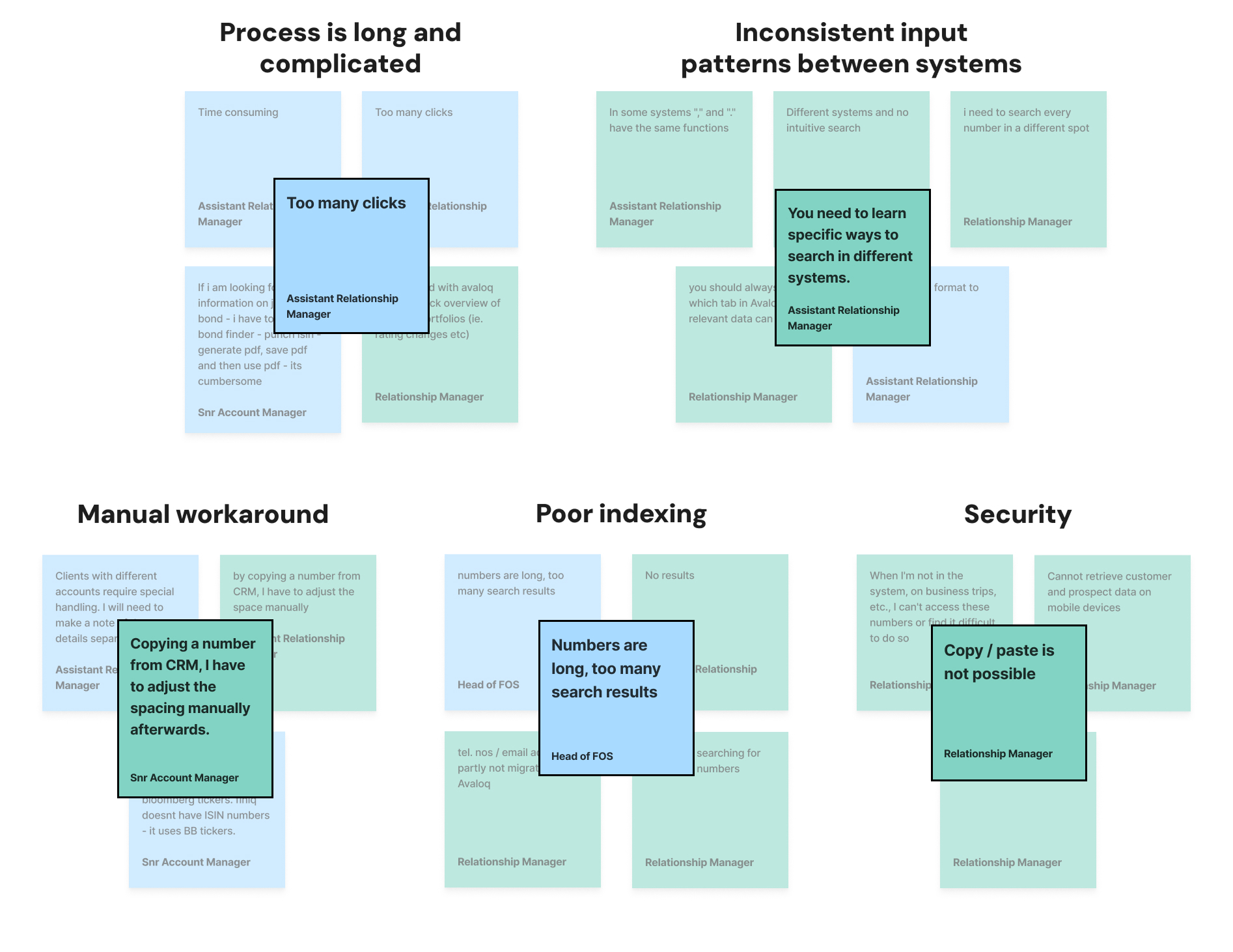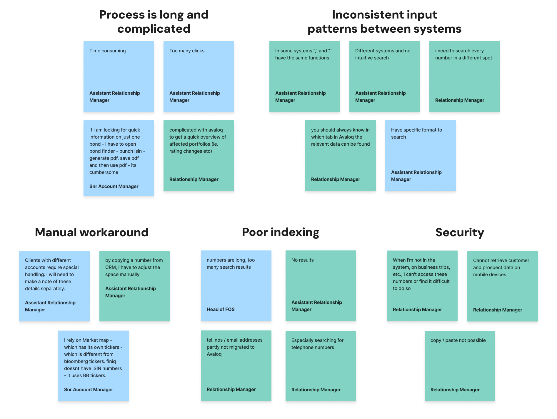 The primary pain point and user need from each affinity group was captured by a single, pivotal user quote.